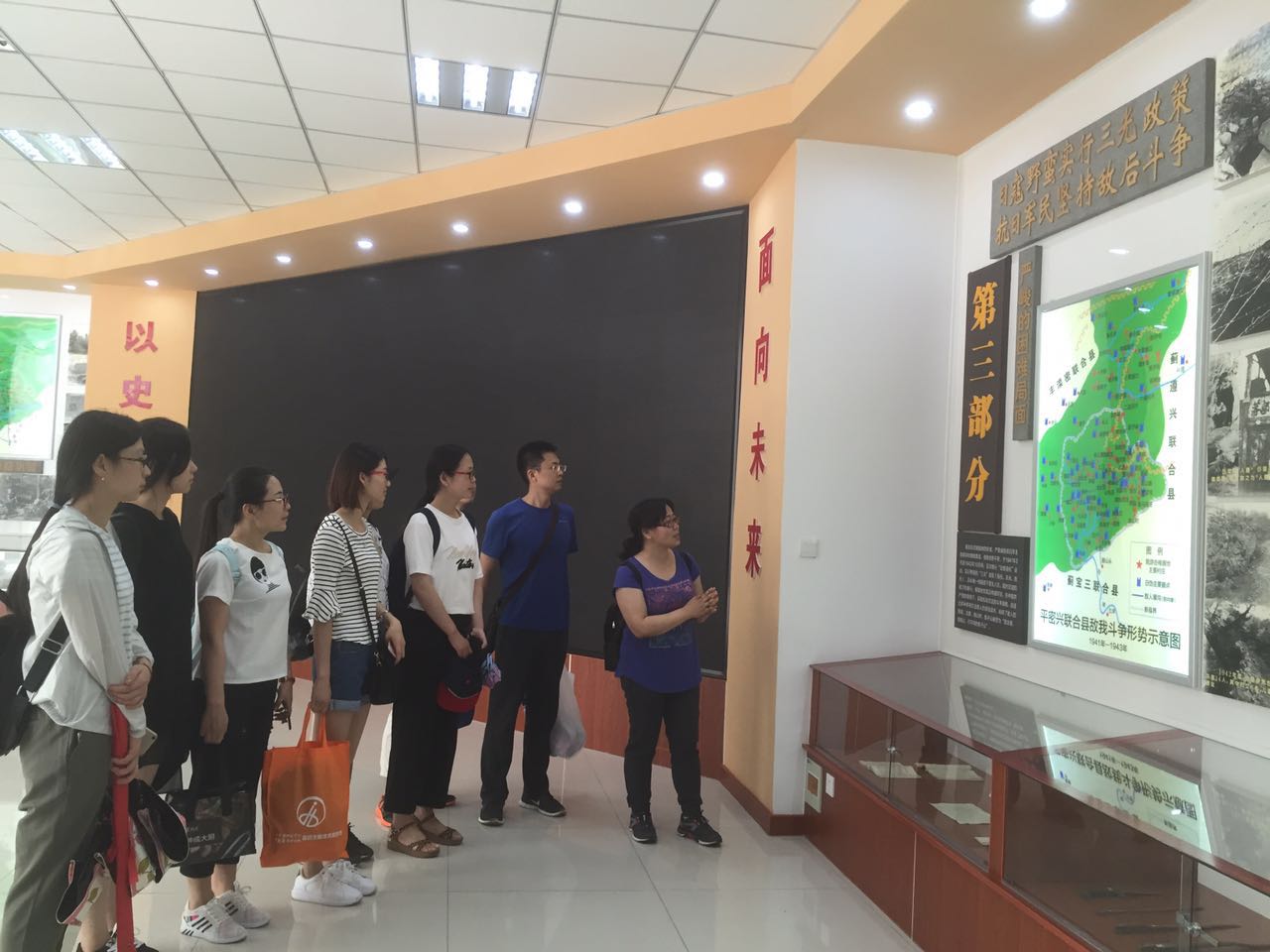 大家仔细参观了橱窗里陈列的八路军的军服、民兵自制的地雷、手榴弹,以及缴获日军的军服和刺刀等物品以及馆的右侧壁上刻的平谷抗日战争革命烈士英名录。参观过程中,党员们无不为抗日将士的勇气所震撼,无不被抗日将士的精神所感染。在敌我悬殊的情况下,中国共产党以马列主义毛泽东思想为指导,理论联系实际,同时与人民群众密切结合,在艰苦卓绝的抗战中,优秀的鱼子山儿女,在中国共产党的领导下,与冀东人民一起,前赴后继,浴血奋战,为祖国的独立,民族的解放,做出了伟大的贡献。